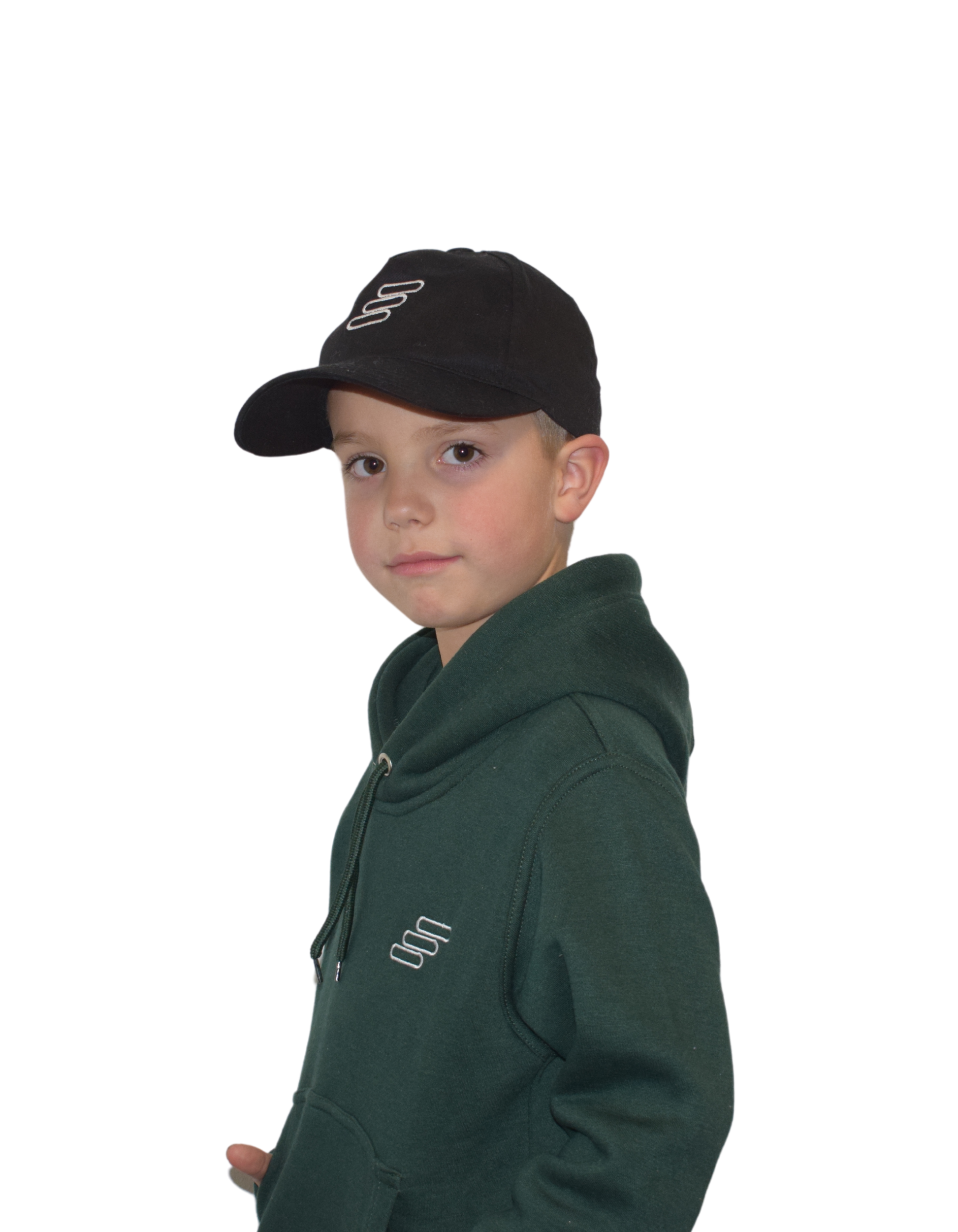 Casual cap for boys and girls, one size . Color black with embroidered SUPPO logo in white. Normal 6-panel model. Strap is adjustable.